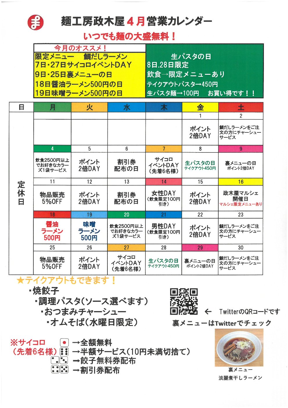 麺工房政木屋 4月のイベントカレンダーのお知らせ!