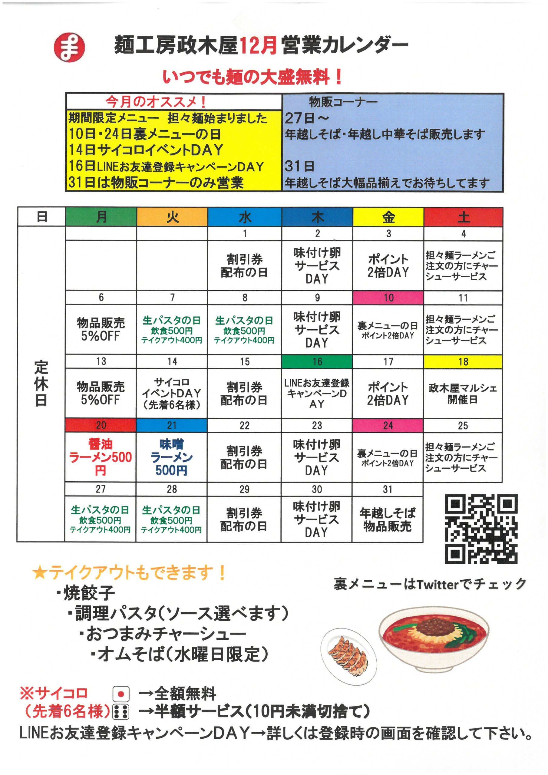 なお、新年は麺工房政木屋、麺のhacoは1月4日より通常営業、ラーメンつる味は5日より通常営業となります。